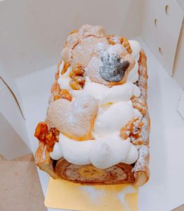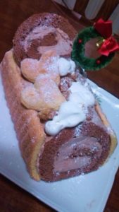 バナナロールケーキ。肉球型クッキーがのっています。